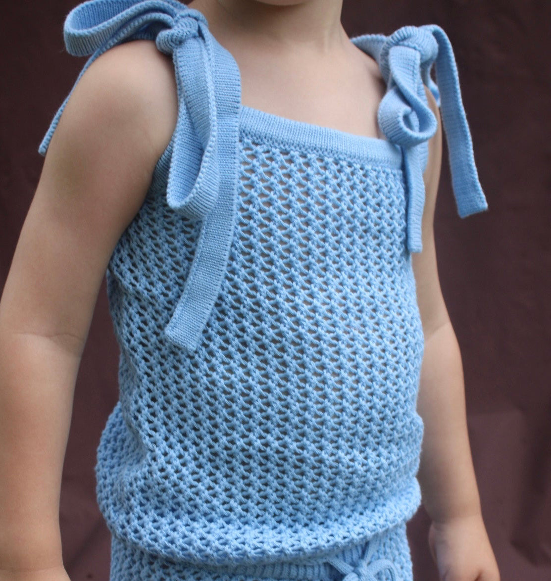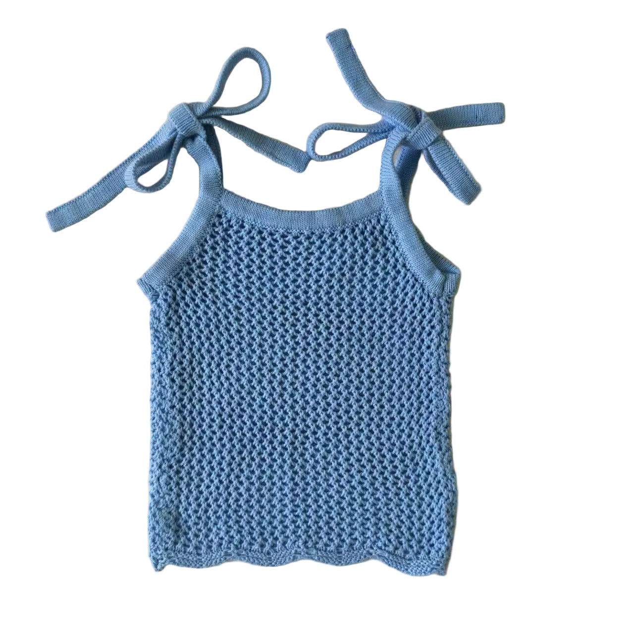 Blue crochet style top with adjustable tie up straps made from 100% cotton